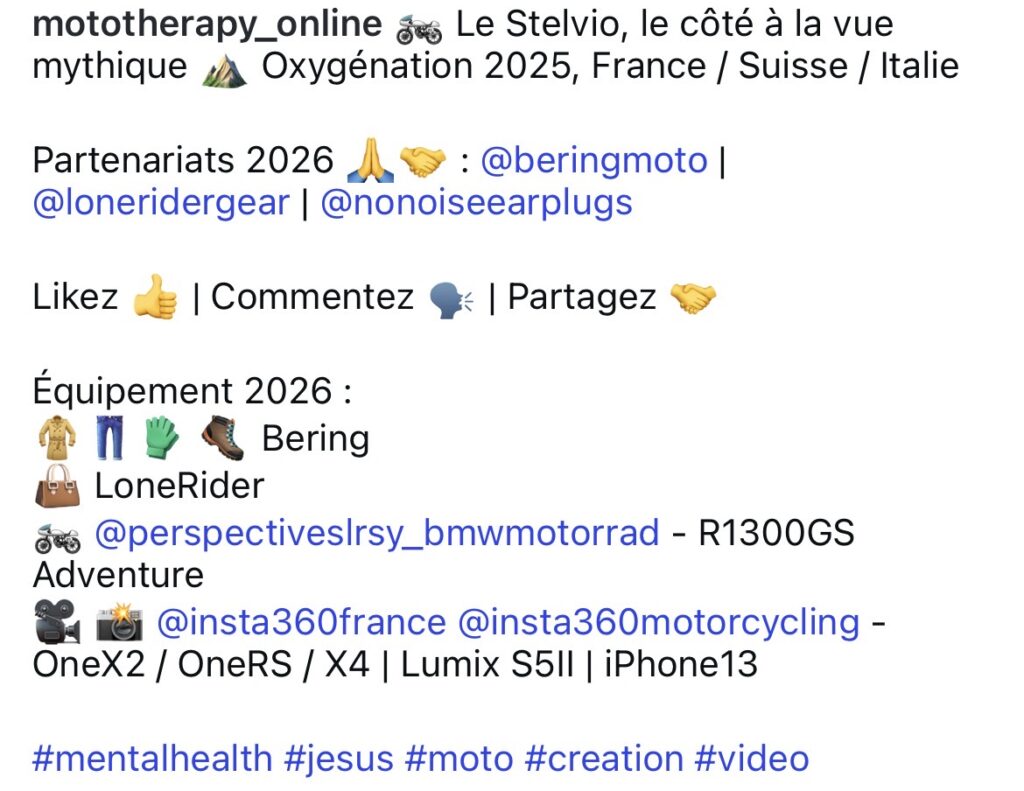 Enfin, vous avez les 5 hashtags autorisés sur Instagram qui reprennent, étonnamment, la raison d’être de cette page : la foi, la santé mentale et la moto.