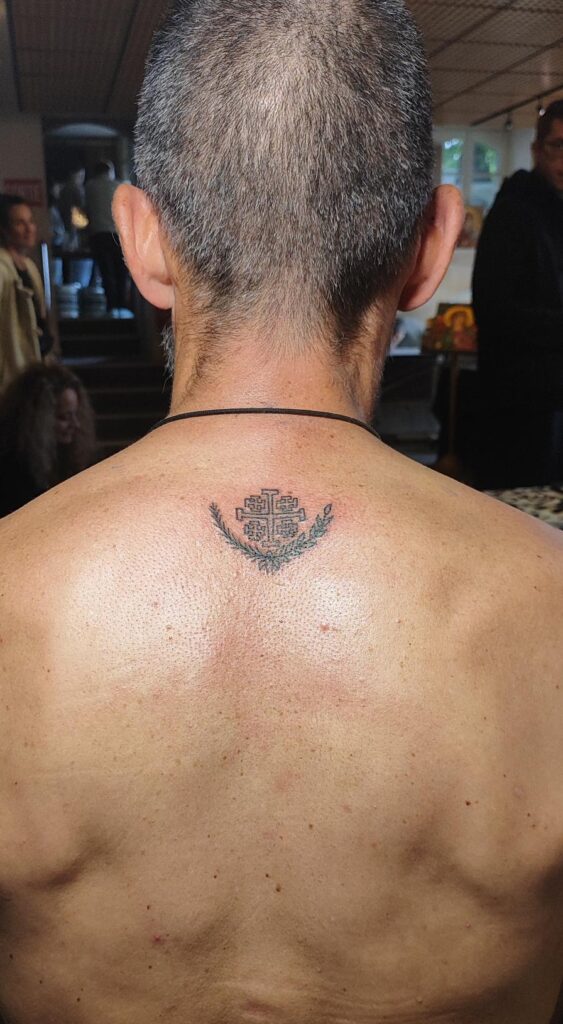 Le tatouage : une croix de Jérusalem.