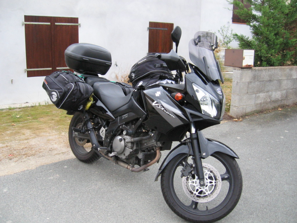 Une sacoche aimantée sur la premiere DL650 (ça ne tenait pas bien quand chargé à mort, ça laissait des marques sur le réservoir, et même avec la housse de pluie, l’eau passait).