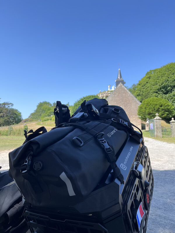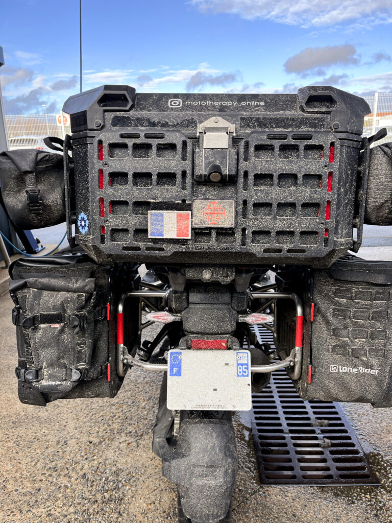 Avec tous les sacs déjà en place, tout trouve sa place naturellement, même en duo pour deux semaines de vadrouilles, du coup, l’AR de la valise droite est dispo en cas de besoin d’y ajouter l’autre tallbag… j’avais pensé au Booster et/ou au chargeur, mais ils tenaient sur les sacs internes des MotoBags pleins à craquer…