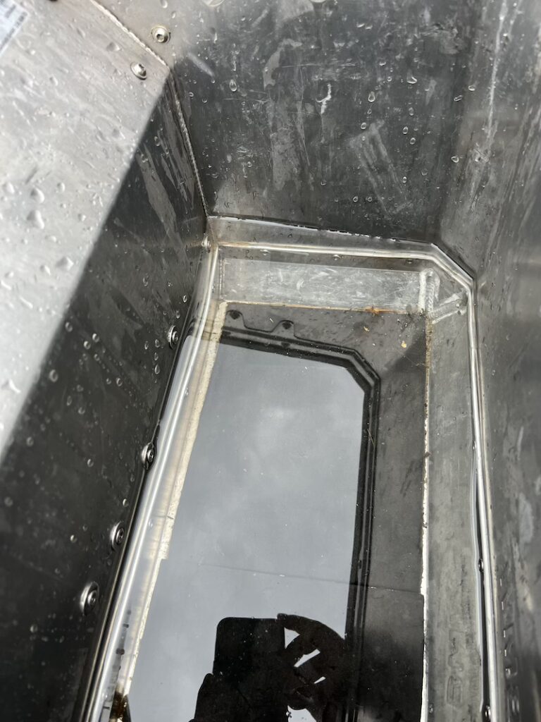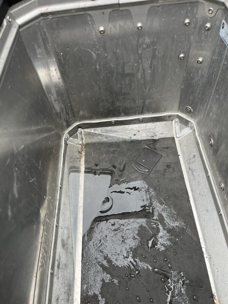 Illustration : ça, c’est la valise gauche BMW après une journée de roulage sous la flotte en allant dans le Frioul l’an dernier (pluie du Stelvio jusqu’au Frioul, via Passo Sella et Giau…)