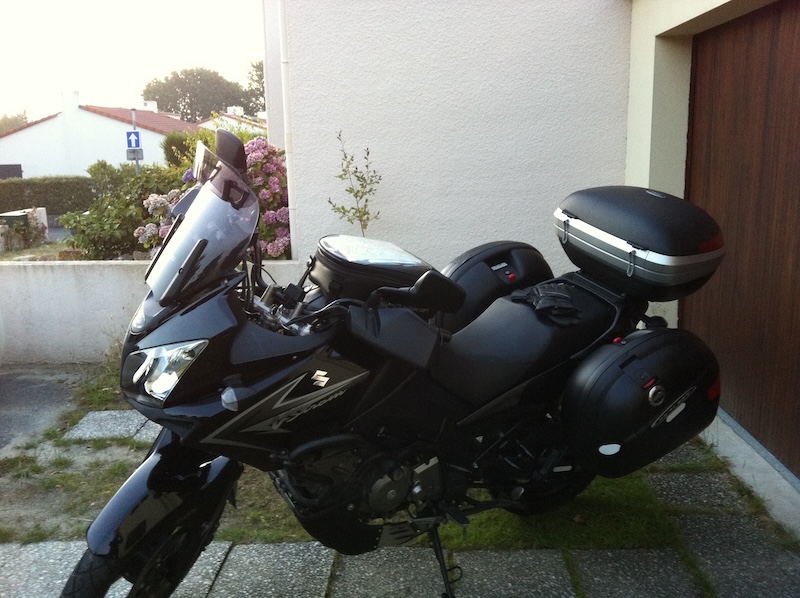 Les Givi devait être déposées quelque part puisque fixée sur l’anneau du bouchon de réservoir (donc posée sur la pompe ou la selle passager en se contorsionnant un peu).